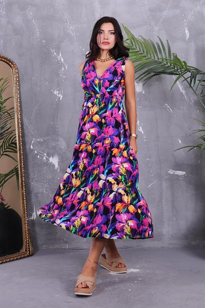 Kruvaze Yaka Sırtı Bağlamalı Kloş Elbise (4Y-ELB0203-MOR)