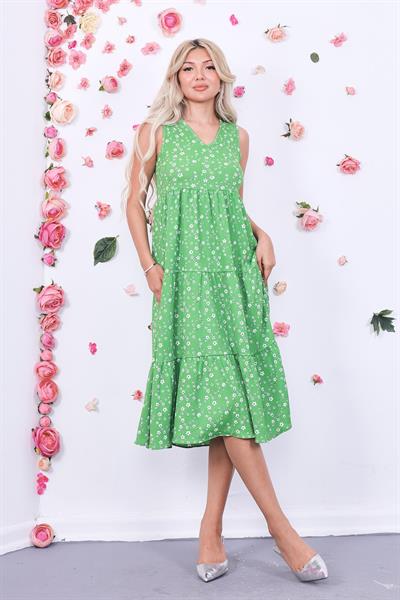 V Yaka Çiçekli Pileli Elbise (4Y-ELB0123-YŞL)